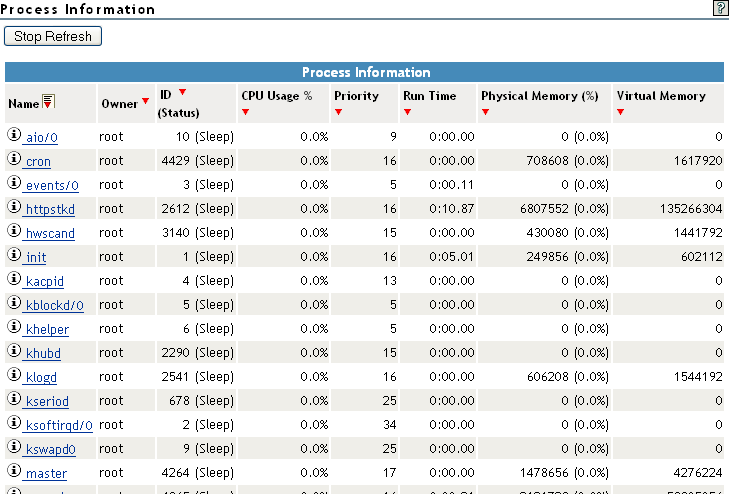 Clicking the link in the navigation frame displays the Process Information page. On this page, you can view a list of all the processes as well as their state in the host and perform the actions listed in the following table.