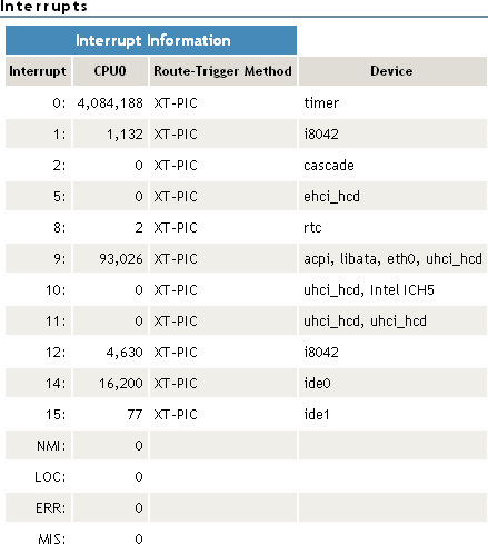 Clicking the link under the heading in the navigation frame displays the Interrupts page, which includes the following: