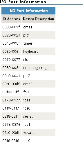 Clicking the link under the heading in the navigation frame displays the I/O Port Information page, which includes the following: