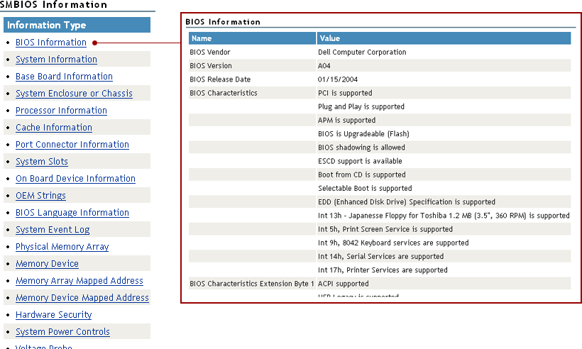 Selecting an information type displays information contained within SMBIOS for the type selected. For example, to see all the BIOS information, click the link. See Figure 11-5.
