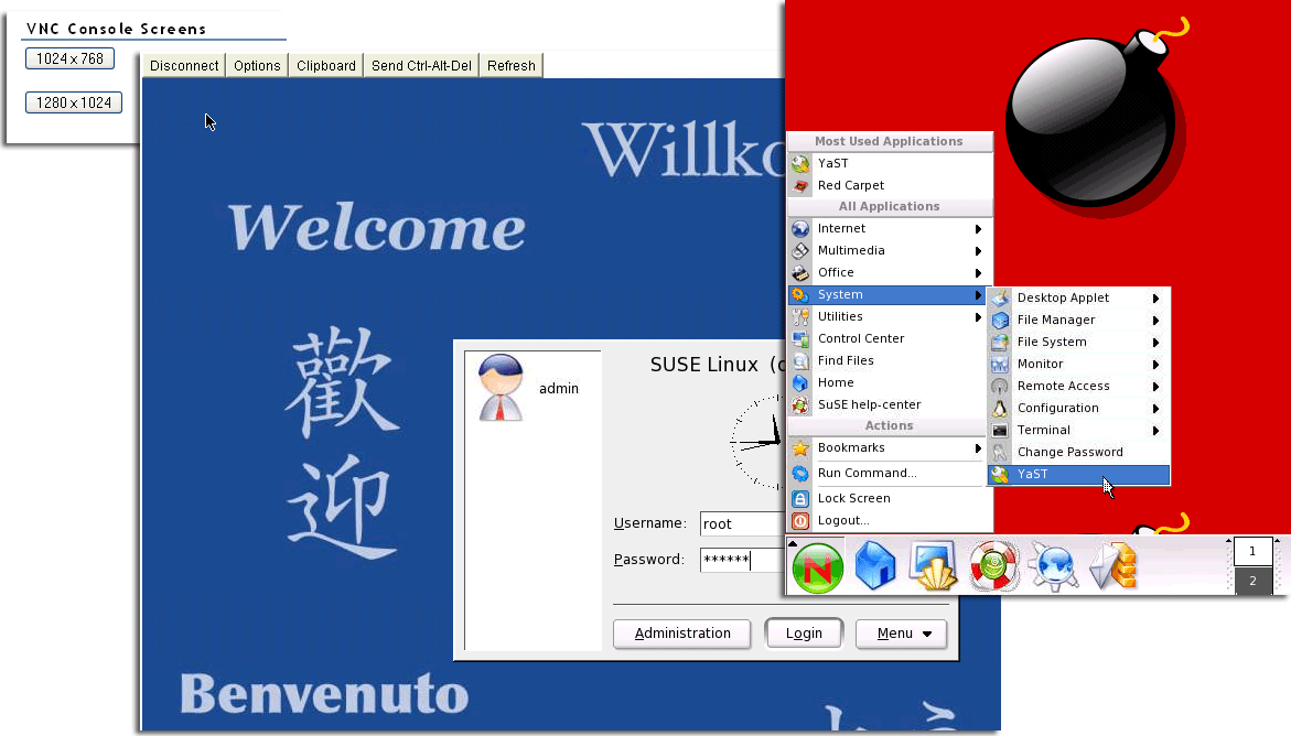 Figure 10-1 Example Access of YaST through NRM VNC Console Screens Linux on a KDE Desktop.