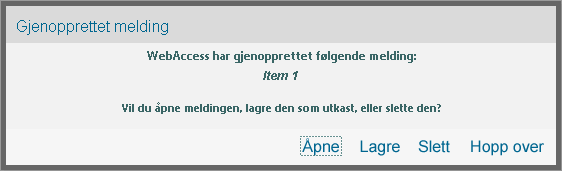 Når du starter WebAccess og bare én autolagret melding kan gjenopprettes, vises følgende melding: