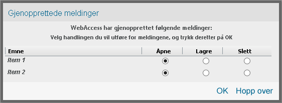 Hopp over: Beholder de lagrede meldingene på disken, men meldingene gjenopprettes ikke i WebAccess. Neste gang du starter WebAccess, vises autolagringsvinduet på nytt.