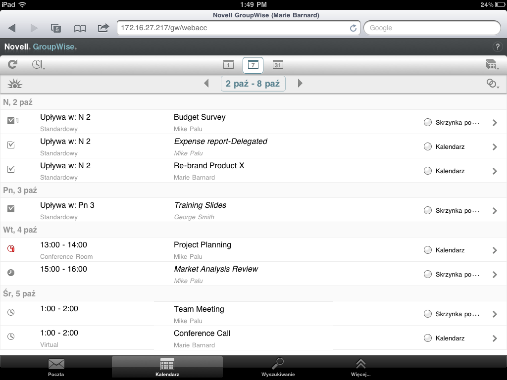 Po zalogowaniu się do systemu GroupWise za pomocą przeglądarki sieci Web na urządzeniu tablet zostanie wyświetlona skrzynka pocztowa.