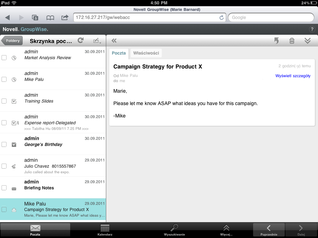 Skrzynka pocztowa jest automatycznie odświeżana po otrzymaniu nowych przesyłek, co pozwala przeglądać zawartość skrzynki pocztowej programu GroupWise w czasie rzeczywistym.