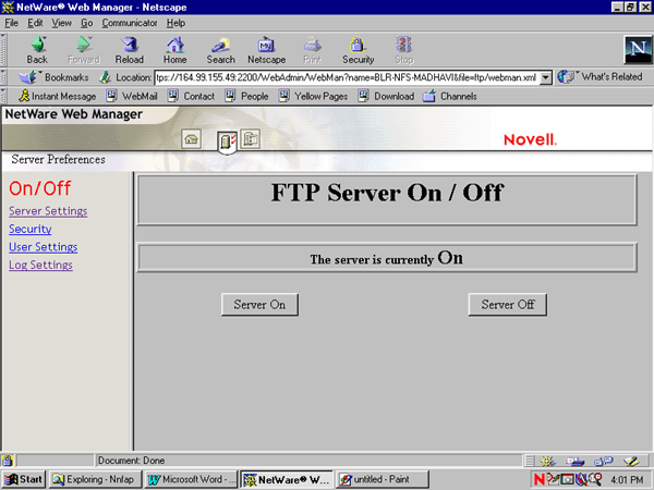 When you click this icon, the initial main panel displays FTP Server On/off Panel. You can start or stop NetWare FTP Service from the client side by clicking either of the buttons.