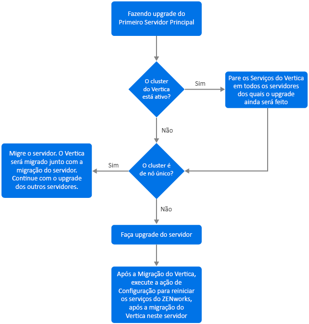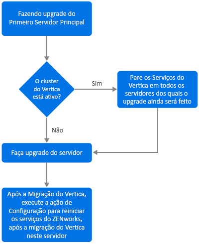 Após o upgrade, a zona será executada com recursos limitados até que seja feito o upgrade de todos os servidores nos quais o Vertica está habilitado. Após o upgrade de todos os servidores nos quais o Vertica está habilitado, execute a ação de Configuração microfocus-zenworks-configure -c Start para reiniciar os serviços do ZENworks no primeiro Servidor Principal do qual você fez upgrade.