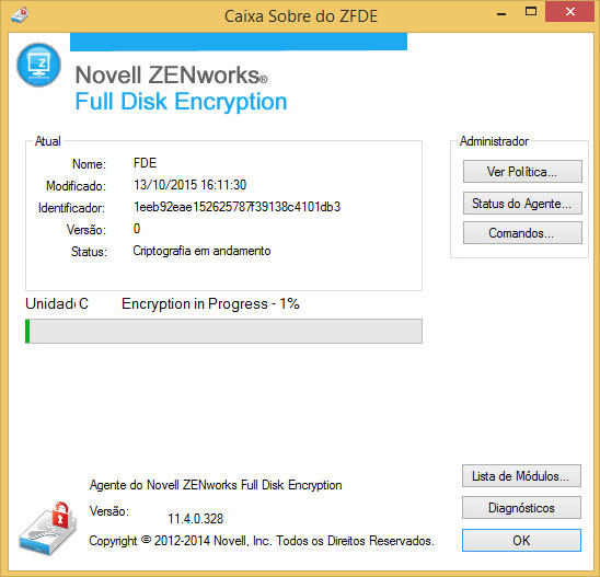 É possível ver a caixa Sobre do ZENworks Full Disk Encryption para monitorar o processo de criptografia: