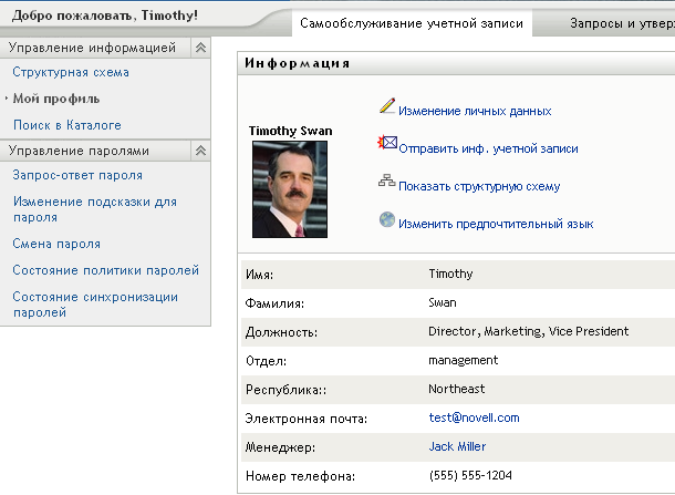 Ниже приведен сценарий создания ссылки на подробные сведения о другом пользователе или группе. Тимоти Сван (вице-президент по маркетингу) входит в Identity Manager User Application и переходит на страницу "Мой профиль".