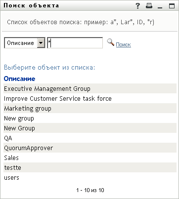 Щелкните имя пользователя или группы, чтобы выбрать его. В следующем примере показана страница поиска объектов для всех групп:
