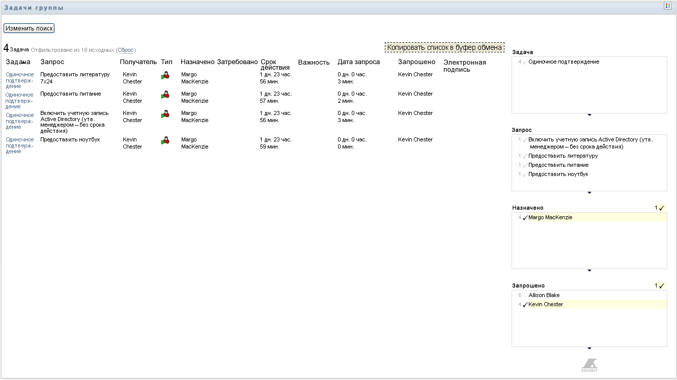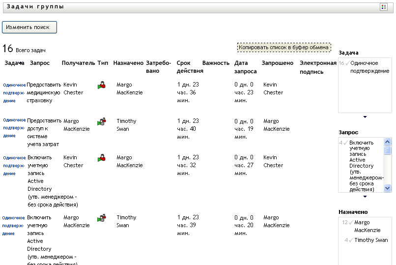 Для отбора части задач используйте . Чтобы просмотреть задачи, выделившие или отозвавшие ресурсы для пользователя или группы, выберите . Чтобы просмотреть задачи, за выполнение которых отвечает пользователь или группа, выберите . Можно выбрать оба вида задач.