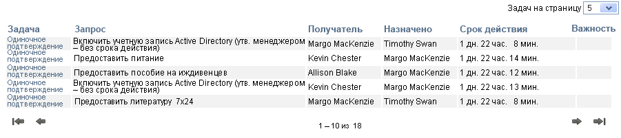Отображение по шаблону позволяет сортировать столбцы по значению, задавать число задач на страницу и выполнять переходы по страницам списка задач.