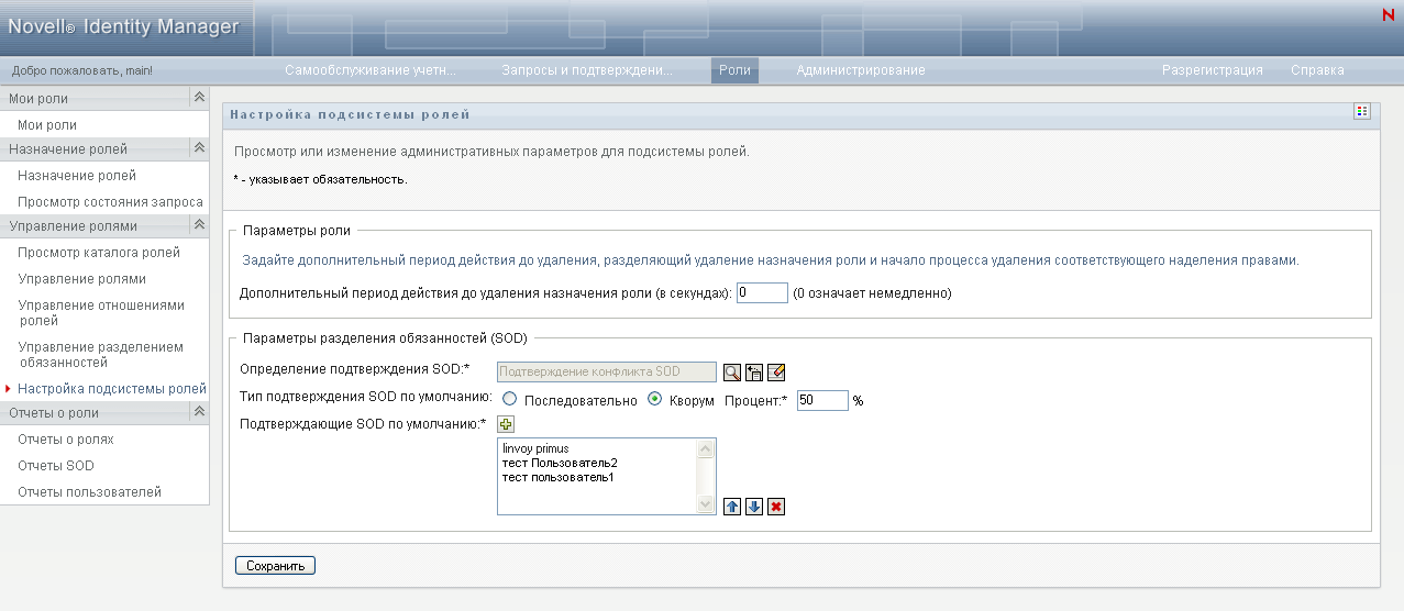 Чтобы определить параметры администрирования для подсистемы ролей: