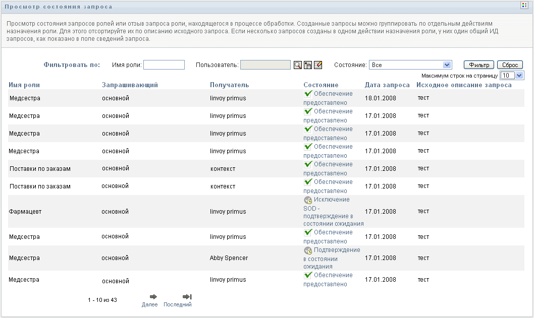 То, что Вы можете увидеть и сделать на странице "Просмотр состояния запросов", зависит от Вашей роли в системе безопасности, как описано ниже: