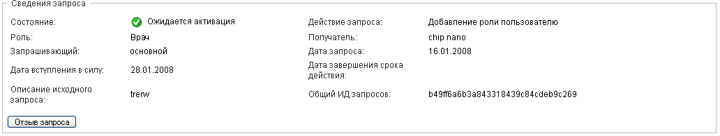 Действие позволяет просматривать состояние Ваших запросов ролей, в том числе как запросов, сделанных Вами непосредственно, так и запросов назначения ролей для групп или контейнеров, к которым Вы принадлежите. С его помощью можно увидеть текущее состояние каждого запроса. Кроме того, это действие дает Вам возможность отозвать запрос, обработка которого еще не завершена или не была прервана, если Ваши намерения изменились и Вы не хотите, чтобы запрос был выполнен.