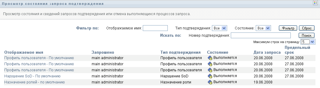 Действие показывает все запросы на подтверждение, включая те, которые инициализируются, работают, завершены или в которых возникли ошибки.