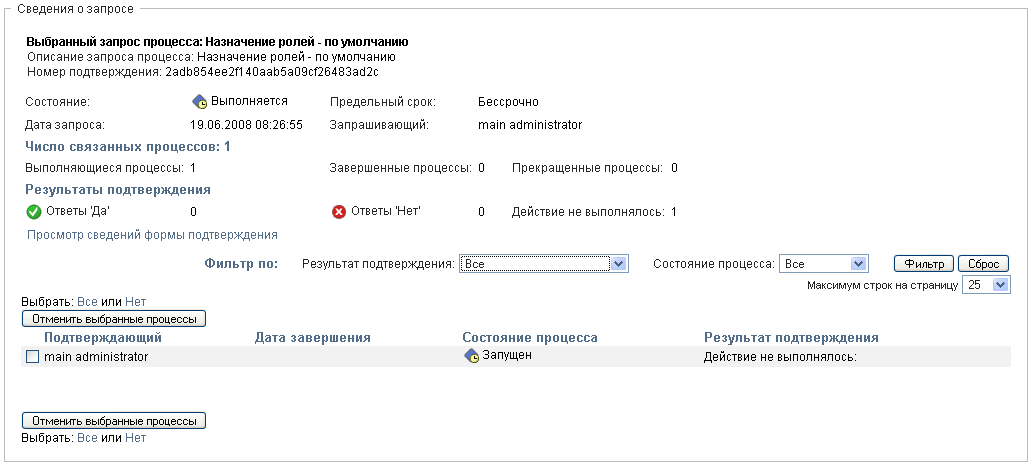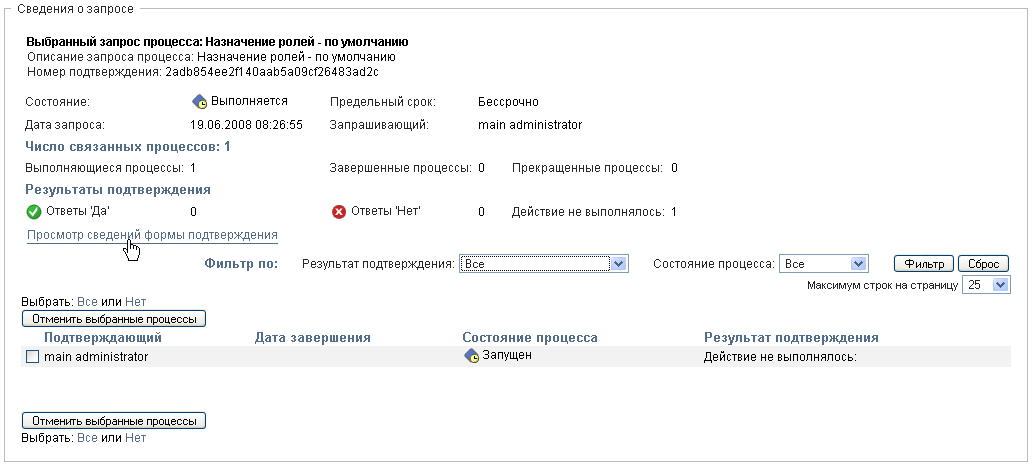 Действие позволяет узнать состояние ваших запросов на подтверждение. Кроме того, оно дает возможность увидеть в подробностях состояние каждого рабочего процесса, начатого для запроса, и при необходимости отозвать один или несколько работающих процессов.