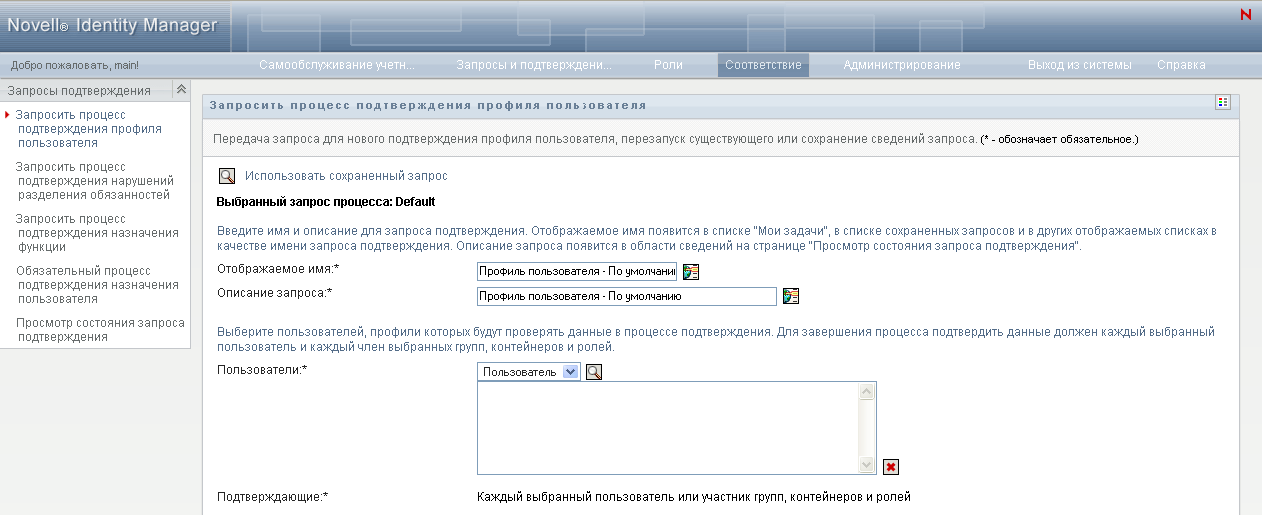 По умолчанию вкладка Соблюдение показывает страницу процесса запроса на подтверждение профиля пользователя.