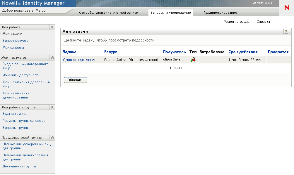 По умолчанию после входа в интерфейс пользователя Identity Manager вкладка открыта и отображает страницу "Мои задачи".