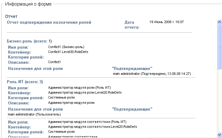 Для процессов подтверждения назначения функций, назначения пользователей и SoD форма содержит отчет, показывающий данные, подлежащие просмотру: