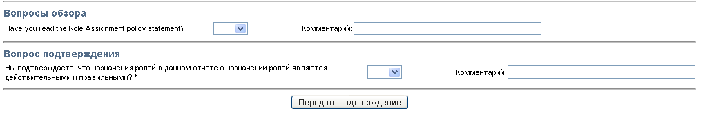 При рассмотрении задачи, связанной с запросом подтверждения, вам необходимо просматривать сведения, отображаемые формой подтверждения. Дополнительно, вам необходимо ответить на требуемый вопрос о подтверждении, что показывает, подтверждаете ли вы правильность данных, и, в ряде случаев, ответить на один или несколько вопросов опроса. Для процессов подтверждения профилей пользователей форма содержит параметры вашего пользовательского профиля, которые вам следует проверить на точность. Для процессов назначения функций, назначения пользователей и подтверждения SoD форма содержит отчет, в котором показано назначение функций, назначение пользователей или данные SoD, которые требуется проверить.