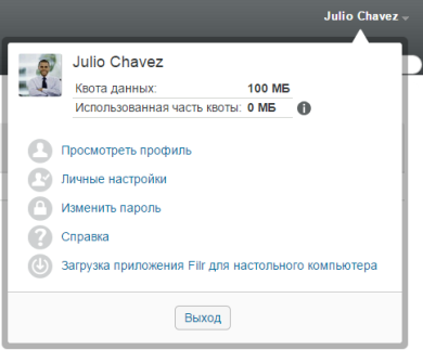 Щелкните ссылку с именем в правом верхнем углу любой страницы Filr.
