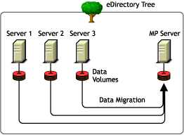 Во втором примере предполагается, что у Вас есть три сервера NetWare 5 и недавно Вы приобрели многопроцессорный сервер, на котором планируется установить NetWare 6.5. Вы хотите мигрировать данные со всех трех серверов на один сервер NetWare 6.5. Чтобы не переносить все данные и агенты принтеров вручную или не создавать резервные копии данных с трех серверов с их последующим восстановлением на сервере NetWare 6.5, можно воспользоваться утилитой консолидации серверов NetWare, автоматизирующей процесс миграции данных.
