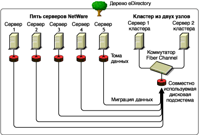 В первом примере предполагается, что у Вас уже есть пять серверов NetWare 5 и недавно Вы приобрели два многопроцессорных сервера и все необходимое оборудование для создания двухузлового кластера с сетью хранения данных (Storage Area Network - SAN). На двухузловом кластере было решено инсталлировать NetWare 6.5, поскольку NetWare 6.5 полностью поддерживает многопроцессорные системы и поставляется в комплекте с программным обеспечением сервиса кластеров Novell Cluster ServicesTM и лицензией на двухузловой кластер. Вы хотите мигрировать данные со всех пяти серверов в SAN на двухузловом кластере. Чтобы не переносить все данные и агенты принтеров вручную или не создавать резервные копии данных с их последующим восстановлением в сети хранения данных, можно воспользоваться утилитой консолидации серверов NetWare, автоматизирующей процесс миграции данных.