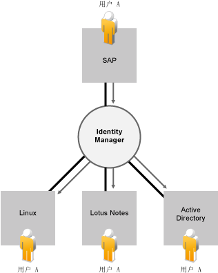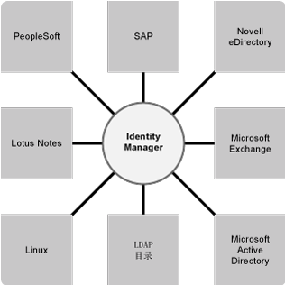 Identity Manager 允许您在多种应用程序、数据库、操作系统和目录之间(如 SAP*、PeopleSoft*、Lotus Notes*、Microsoft* Exchange、Microsoft Active Directory*、Novell eDirectory™、Linux 和 UNIX 以及 LDAP 目录)同步、转换和分发信息。