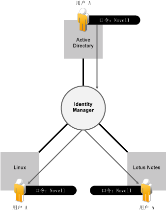 作为其数据同步功能的一部分,Identity Manager 还可帮助您在系统之间同步口令。例如,如果用户更改了在 Active Directory 中的口令,Identity Manager 可将该口令同步到 Lotus Notes 和 Linux。