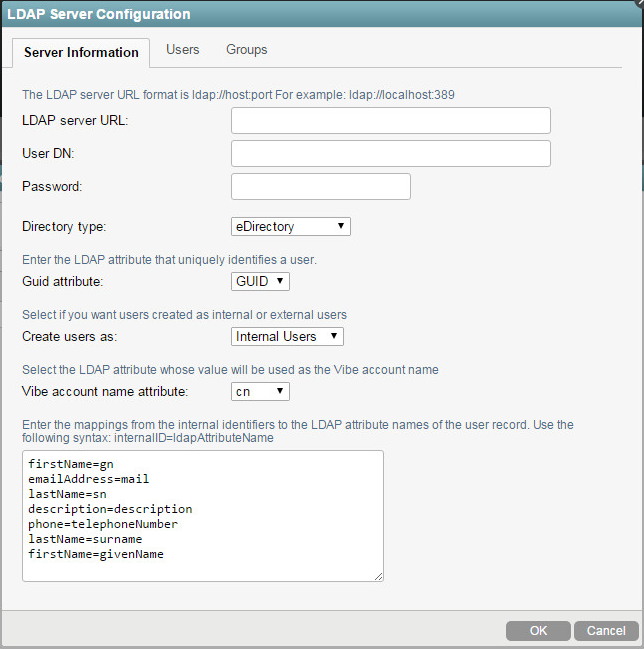LDAP Server URL: In order to synchronize initial user information, Vibe needs to access an LDAP server where your directory service is running. You need to provide the host name of the server, using a URL with the following format: