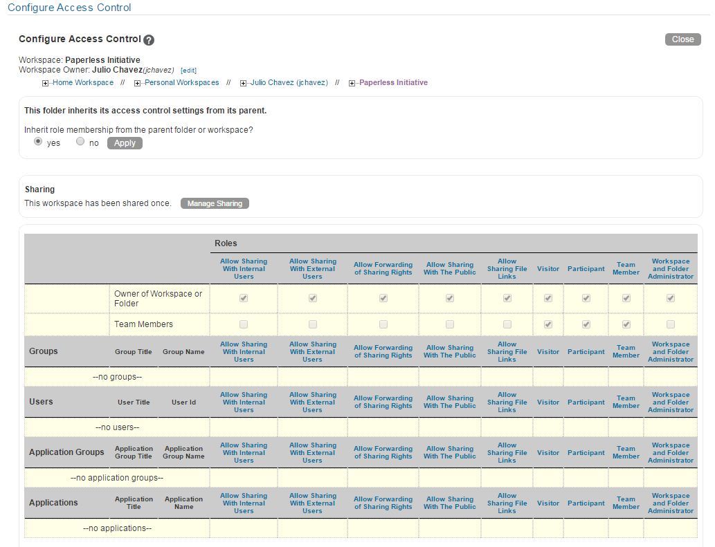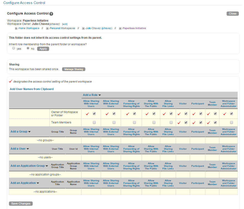 Before you can make modifications to the table on the Configure Access Control page, ensure that the folder or workspace does not inherit its access control settings from its parent folder or workspace.