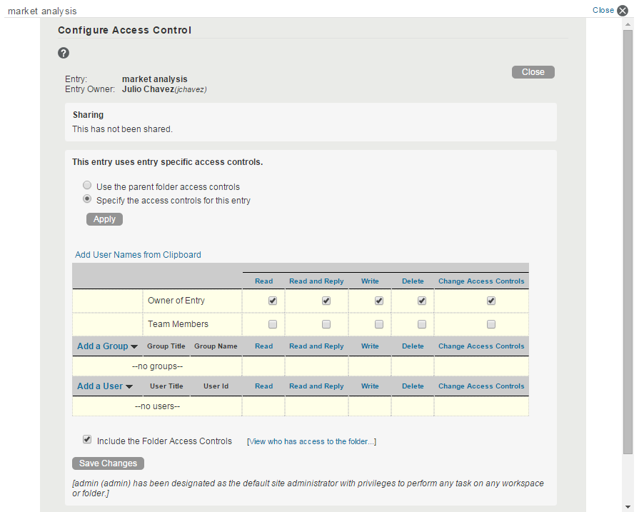 (Optional) Select Include the Folder Access Controls if you want to extend the new entry-level access controls to include the access controls that are already in place for the folder. Selecting this option automatically grants users the same access rights to the entry that they have to the folder.