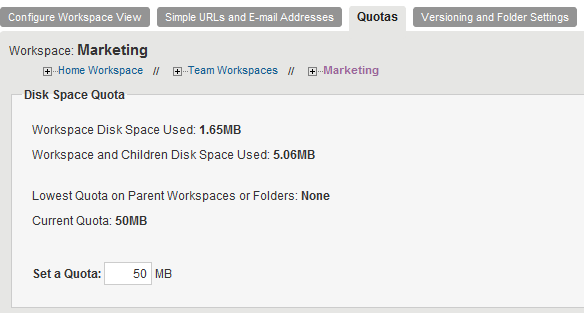 Lowest Quota on Parent Workspaces or Folders: The lowest quota that exists on any workspace or folder that is higher in the folder hierarchy than the workspace or folder that you are currently viewing.