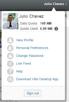 If your administrator has set a user data quota and if you are an active contributor to your Micro Focus Vibe site, you might want to periodically view your current data quota to ensure that you are not approaching the user limit.