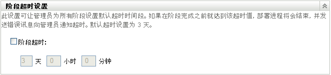 如果在阶段完成前达到超时值,则部署过程会暂停,且系统会向管理员发送一条错误讯息。在错误解决且管理员单击重启动部署过程之前,部署过程会一直暂停。