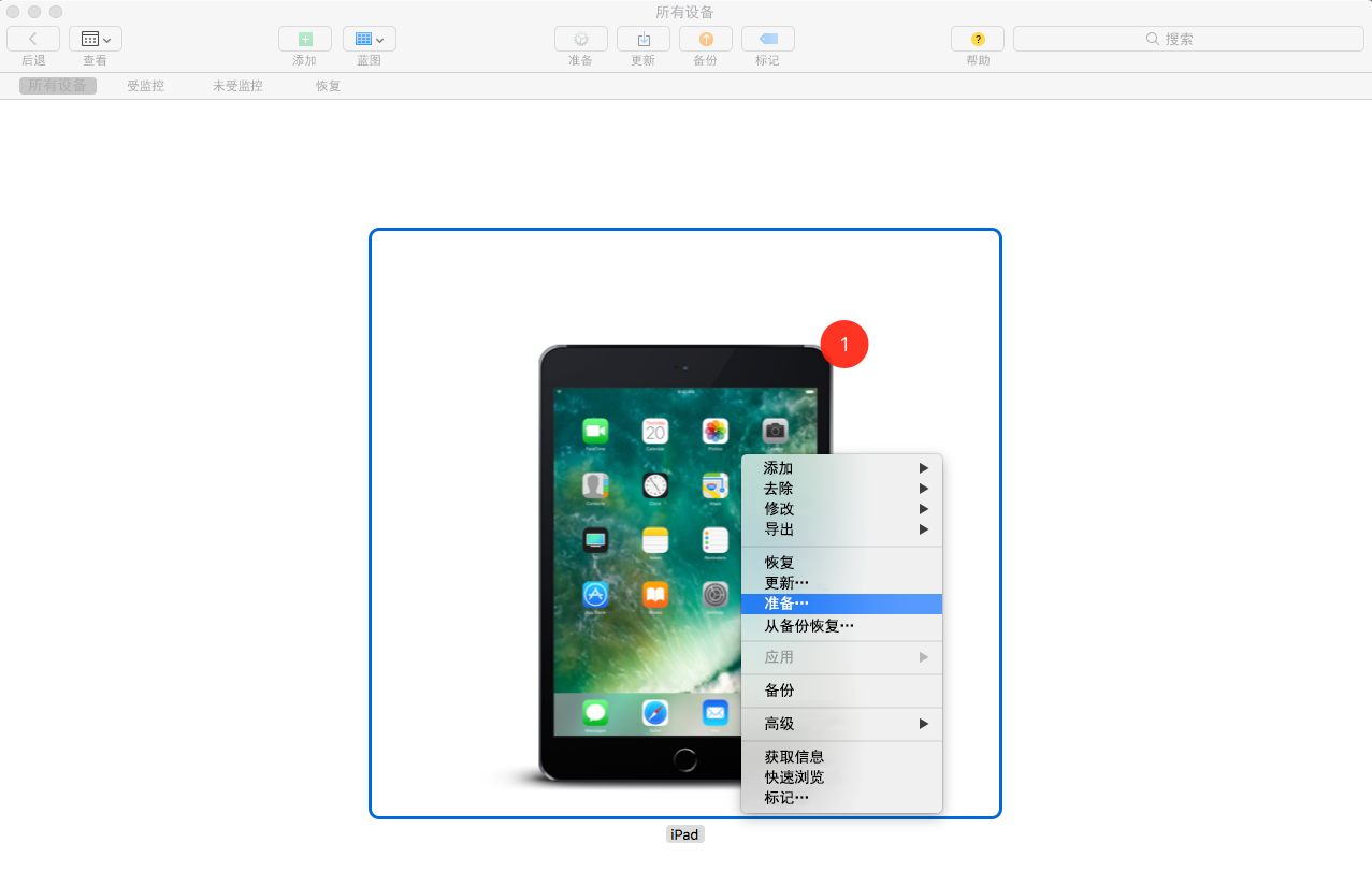 单击右键并选择准备,或选择 Apple Configurator 顶部菜单栏中的准备。