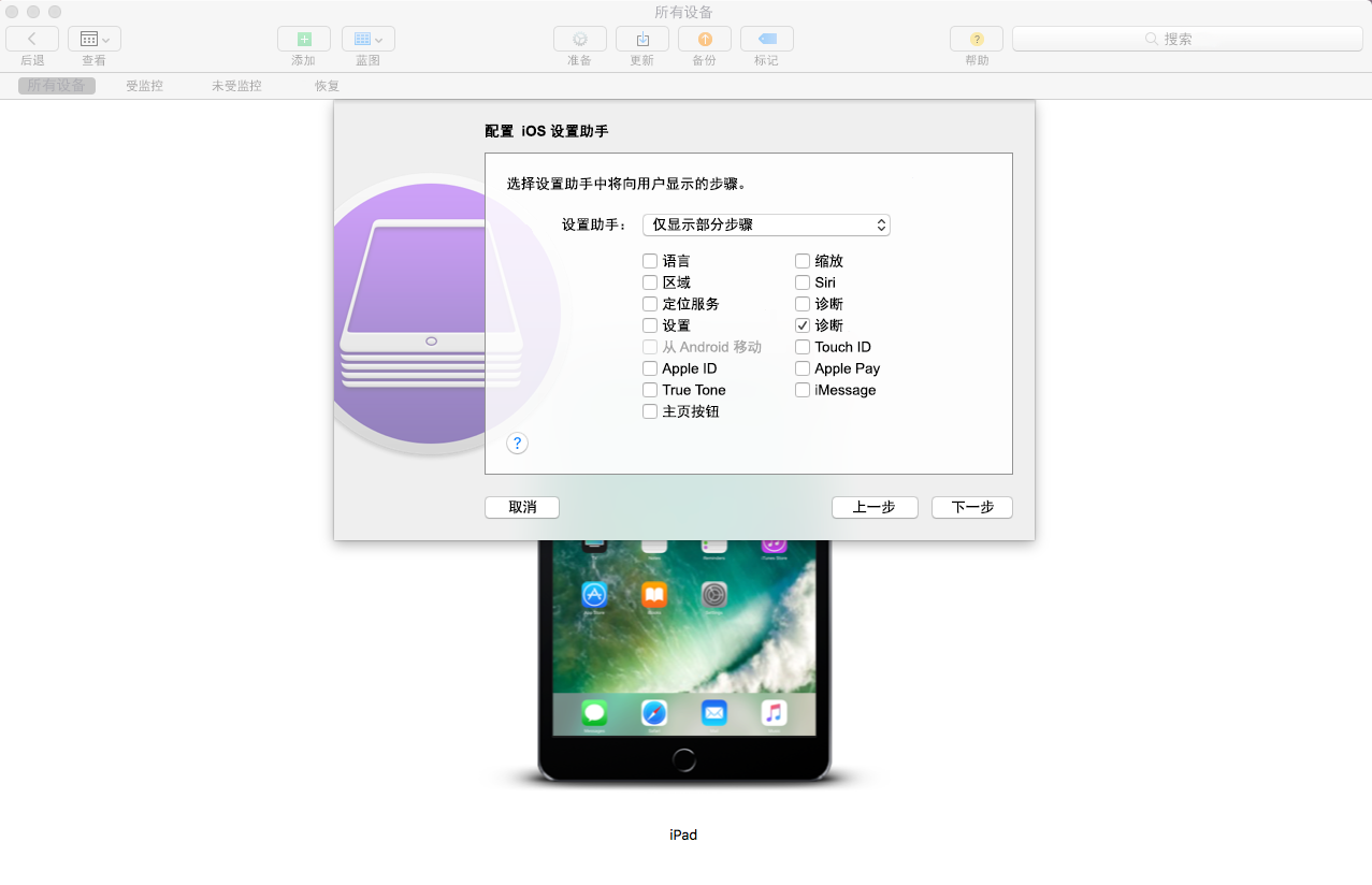 如果要在注册设备期间跳过某些设置步骤,请从设置助手下拉菜单中选择相应的选项。选中注册设备期间要显示的设置项。