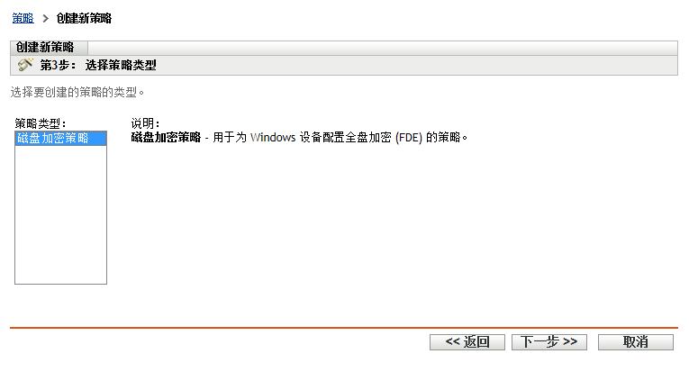 在“选择策略类型”页中,选择磁盘加密策略,然后单击下一步。