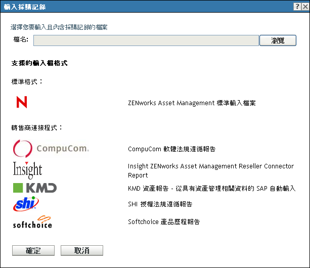 建立採購記錄最簡單的方法是從經銷商提供的檔案輸入。資產管理可以從 CompuCom*、Insight、KMD/SAP*、SHI* 和 Softchoice* 輸入採購記錄。此外,您還可以使用一般輸入格式 (請參閱使用輸入檔案)。