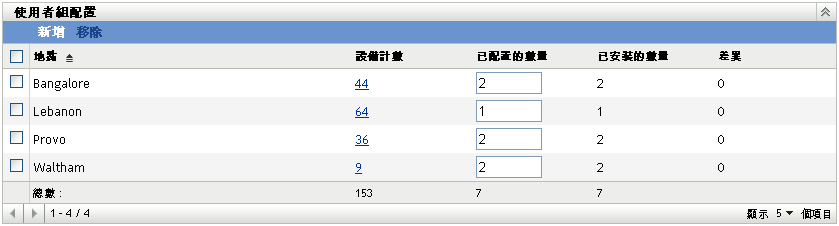 差異為負數表示產品安裝數多於已配置的授權數,差異為正數表示已配置的授權數多於產品安裝數。