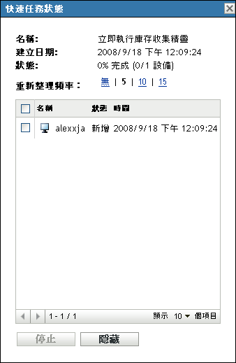 「快速任務狀態」對話方塊會顯示部署的進度。完成後,會在此設備的螢幕上顯示「收集資料表單」。透過選取工作站並按一下「停止」可以停止部署。