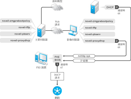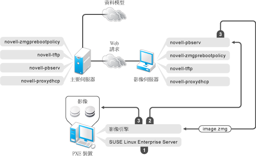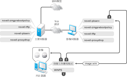 以下各節介紹開機前服務如何在複製影像輔助設備上執行 PXE 開機、ZENworks Imaging 以及協力廠商影像的工作: