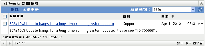 「ZENworks 新聞快訊」面板中會顯示主要伺服器下載的最新 ZENworks 新聞更新。這可能需要一些時間。