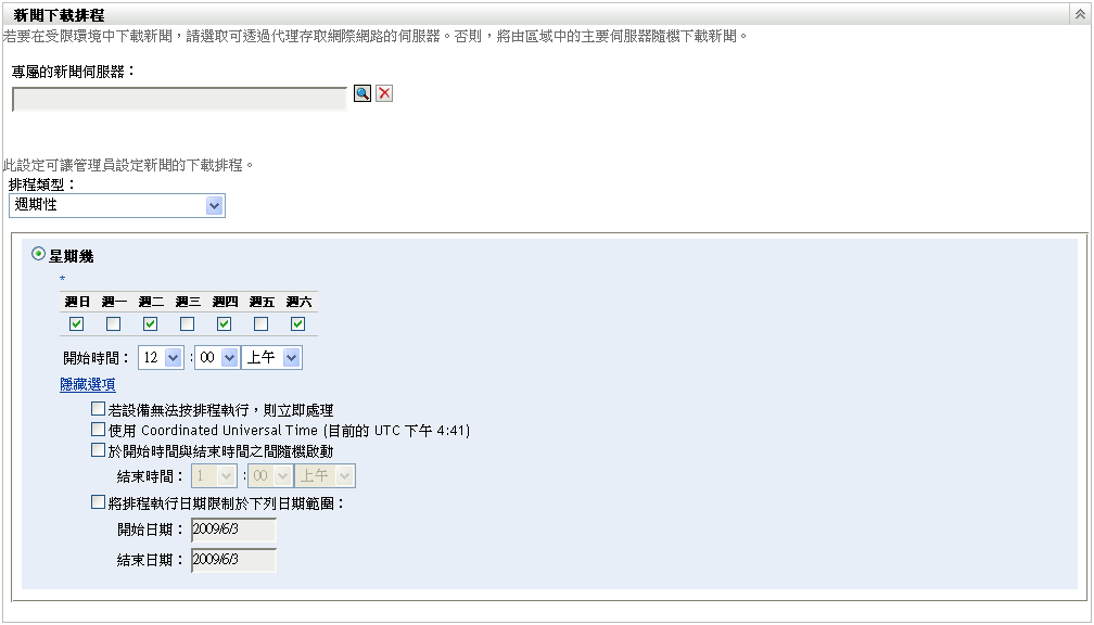 將排程執行日期限制於下列日期範圍︰ 除了其他選項之外,還可指定進行新聞更新檢查的日期範圍。