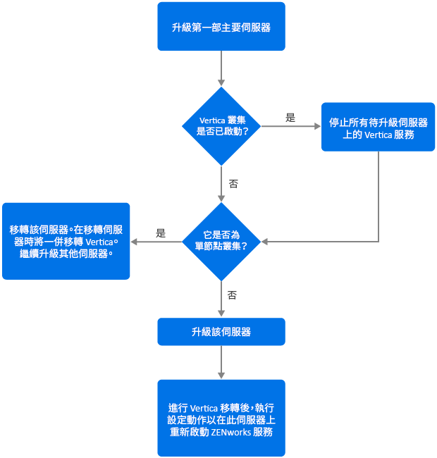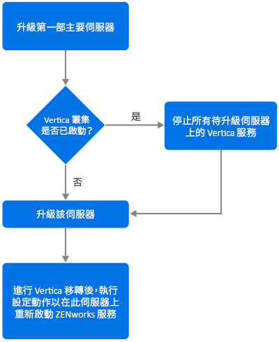 升級後,區域將以有限的能力執行,直至所有啟用了 Vertica 的伺服器均已升級。升級所有啟用了 Vertica 的伺服器之後,執行設定動作 microfocus-zenworks-configure -c Start,以在已升級的第一部主要伺服器上重新啟動 ZENworks 服務。