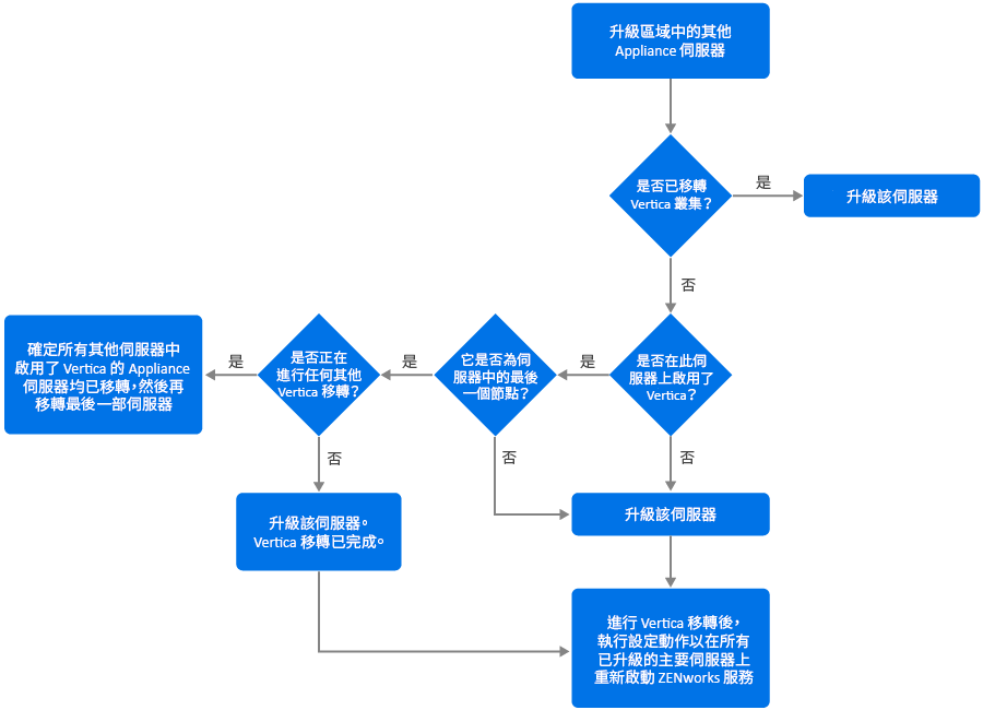 升級 Vertica 叢集中的最後一個節點後,執行設定動作 microfocus-zenworks-configure-c Start,以在目前為止已升級的所有主要伺服器上重新啟動 ZENworks 服務。