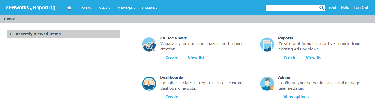 在內部,指定的使用者 ID 將會驗證到 LDAP 伺服器。授權後,LDAP 伺服器將允許您登入應用程式。然後,會顯示 ZENworks Reporting 首頁。