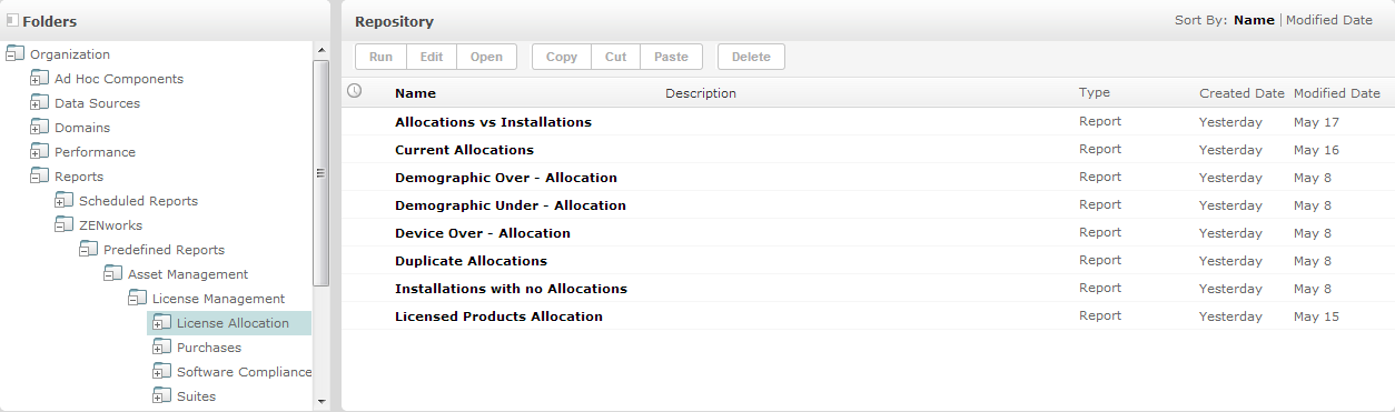 儲存庫是報告、分析檢視窗和伺服器相關檔案的內部儲存區。儲存庫已組織成包含檔案系統等資源的資料夾。但是,與檔案系統不同,儲存庫將以私用資料庫的形式儲存,只有 ZENworks Reporting 才能直接存取它。